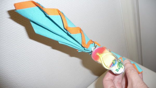 une fois que vous avez plier votre serviette en accordéon maintenir avec un lien cela peu être du bolduc ou bien du fil de fer moi en l occurence j ai opté pour un porte clé en forme de tongue petit cadeau souvenir pour mes invités!!!!